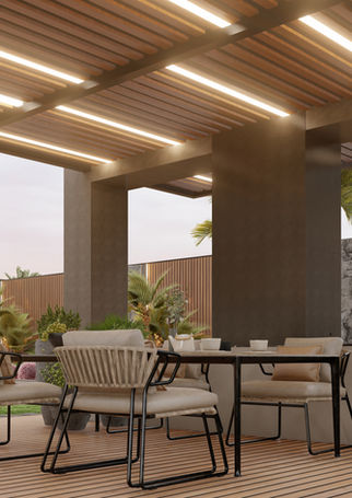 Bu projenin tasarımında modern mimarinin yalın geometrik kurgusu ön plana çıkarılmıştır. Kütleler, birbirini tamamlayan yatay ve düşey düzlemlerle dengelenmiş, böylece yapıda güçlü bir kompozisyon ve görsel hiyerarşi oluşturulmuştur. Cephede kullanılan geniş cam yüzeyler, iç mekânların gün ışığıyla maksimum düzeyde beslenmesini sağlarken, dış mekânla kurulan geçirgen ilişkiyi güçlendirmiştir. Lineer LED aydınlatmalar, yapının modern çizgilerini vurgulayarak gece görünümünde de estetik bir kimlik kazandırmıştır. Balkonlarda kullanılan cam korkuluklar, cepheyi hafifletirken çağdaş bir şeffaflık ve ferahlık hissi yaratmıştır. Üst katta yer alan pergola strüktürü, yarı açık mekân deneyimi sunarak hem gölge kontrolü sağlamış hem de mimari kütleye dinamik bir ifade katmıştır. Malzeme seçiminde modern yüzeylerin kontrastı öne çıkarması amaçlanmış, böylece yapıya hem sıcaklık hem de sofistike bir karakter kazandırılmıştır. Genel olarak tasarım, lüks yaşamı çağdaş bir estetikle birleştiren, güçlü ve davetkâr bir mimari dil ortaya koymaktadır.